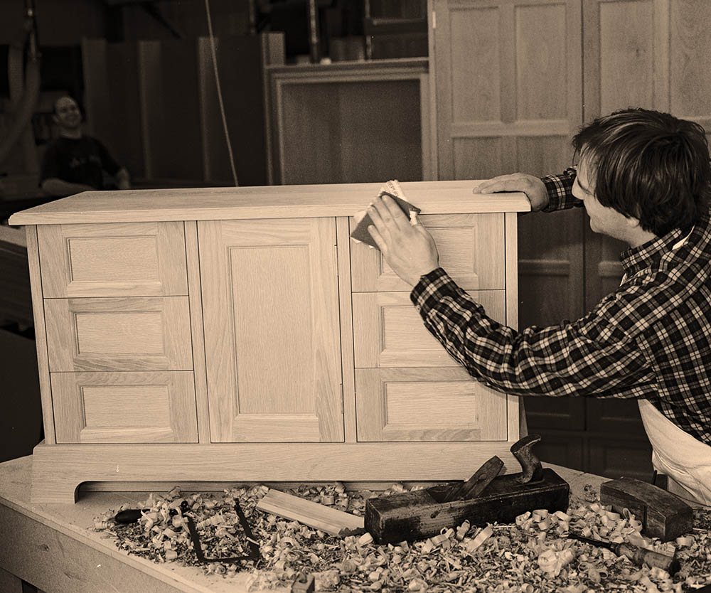 “This is Ian Harris hand finishing a traditional solid oak cabinet in our Midhurst workshop.”