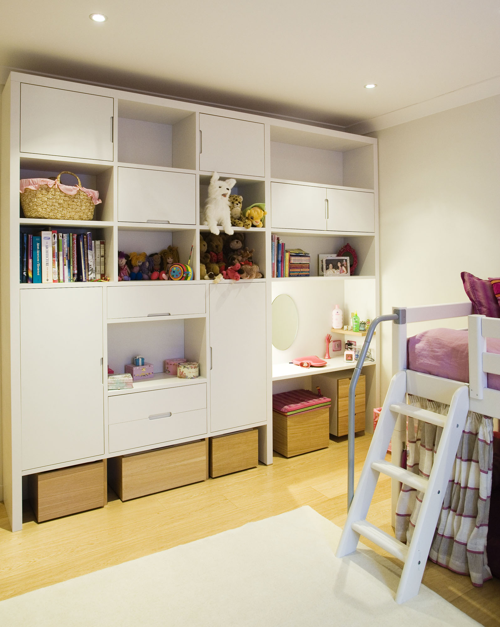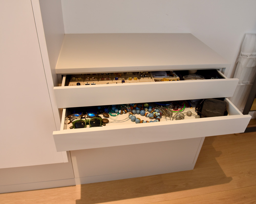 A bespoke fitted wardrobe interior can be tailored with all kinds of storage options. These could include rails, pull-out shoe racks, cubby holes for hats and handbags, belt hangers, watch and jewellery trays, adjustable shelving and more. Open wardrobe display shelves and sections can add an upmarket boutique feel in both a modern or a period-style bedroom interior. You could also have a bespoke dressing table made especially for you, with features such as an extendable magnifying mirror and personalised cosmetics drawers.