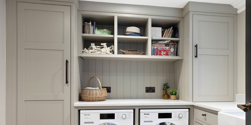 Purpose-designed and custom-made cabinets housing laundry appliances. Coat hooks. Butler sink. Built-in bench seat. Labelled drawers. Pulley airer. Linen press. Shoe and hat racks. Pet beds. A log store… there are so many choices to consider for a boot or utility room, especially one used by a busy household. When every storage feature you want is thoughtfully planned and made to measure, the space will be beautifully organised and a joy to use.
