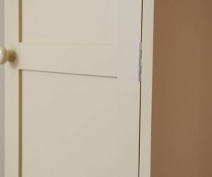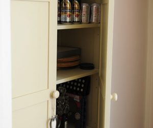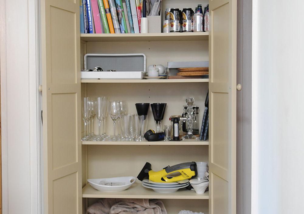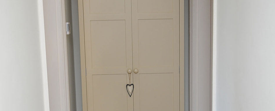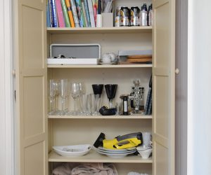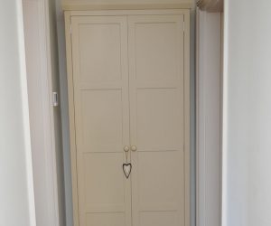 This classic armoire was designed and created to store additional glasses and crockery due to a lack of dining room storage. The cabinet has in-frame Shaker style doors with satin chrome butt hinges. All our cabinets can be lined internally with any wood interior.