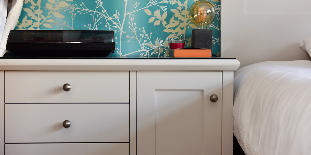 The bespoke bedroom furniture has been flawlessly spray-painted with an environmentally friendly, satin matt water-based paint. Painted grey furniture is on trend and has a luxurious look; and this light soft grey is elegant and restful. Falling into the neutral category, grey is a versatile shade that works well with different colours. Closed storage, such as cupboards and drawers, looks neater and will help to minimise clutter, while the large wall mirror and mirrored wardrobe doors help to make the room look bigger and brighter.