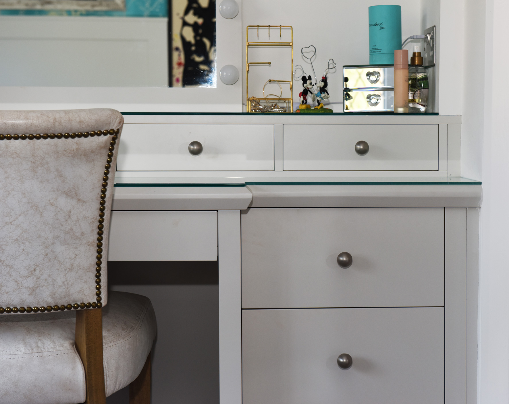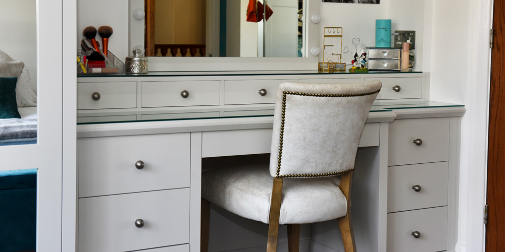 The fitted breakfront dressing table features six deep smooth-gliding drawers and a safety glass surface for easy cleaning. A slim central drawer is neatly concealed under the dressing table top with compartments for hair tools and accessories. Five smaller drawers at the rear of the table top are customised to store jewellery, pens and knick-knacks. The large mirror includes 14 dimmable LED lights adding glamour and practicality to the room. A mirror like this makes the room seem bigger and brighter too. The perfect combination beauty spot and workspace for studying in style.