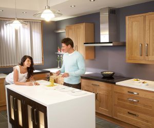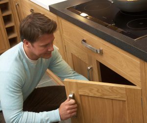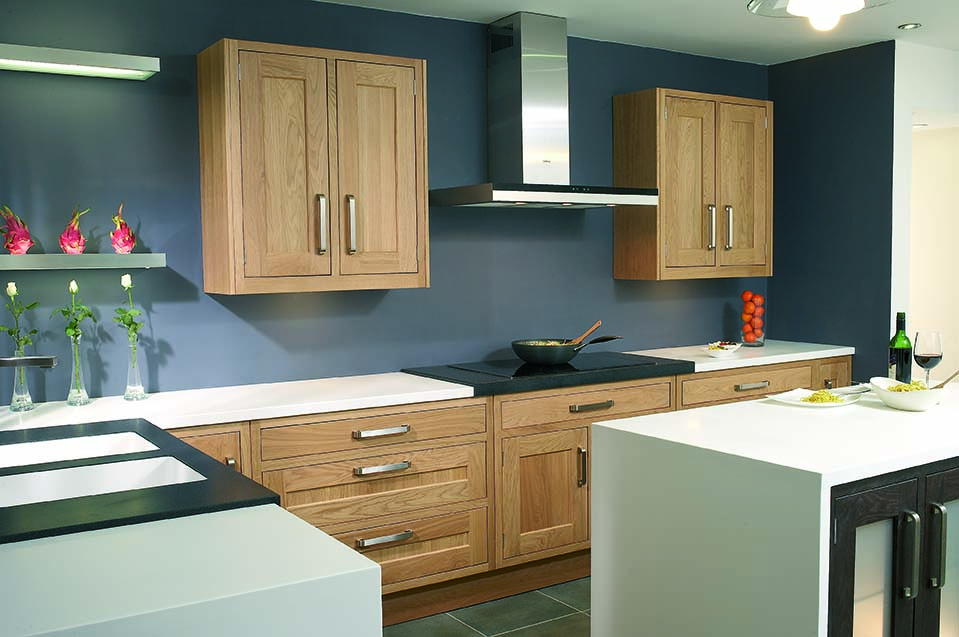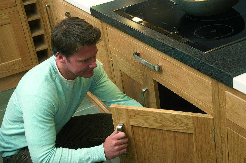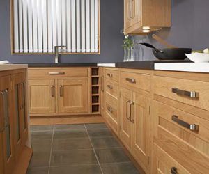 This bespoke kitchen was custom made for a homeowner in the Surrey village of West Horsley. Every aspect was tailored to our client’s specification, successfully mixing the highest quality traditional construction with a modern aesthetic to create an attractive, harmonious space. In the classic shaker style, the handcrafted cabinetry is in solid light oak combined with real oak veneer, adding warmth and texture to the room. A wide variety of storage has been customised and built-in throughout the kitchen.