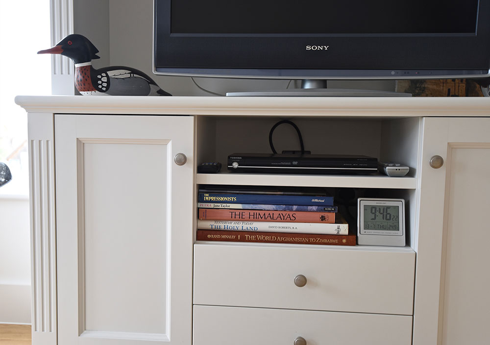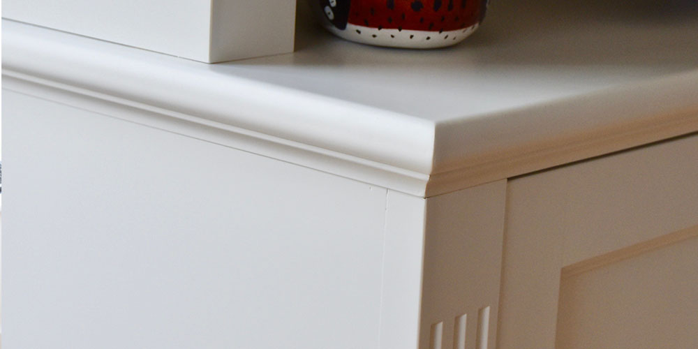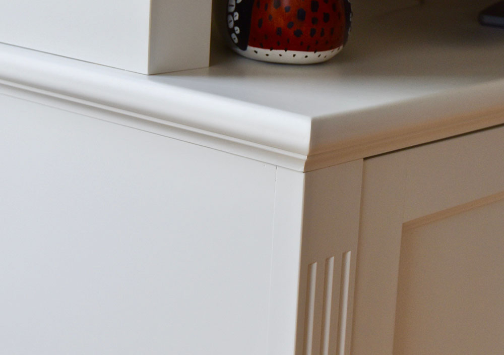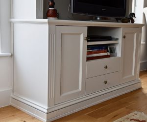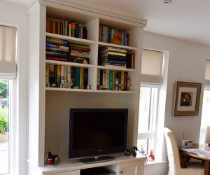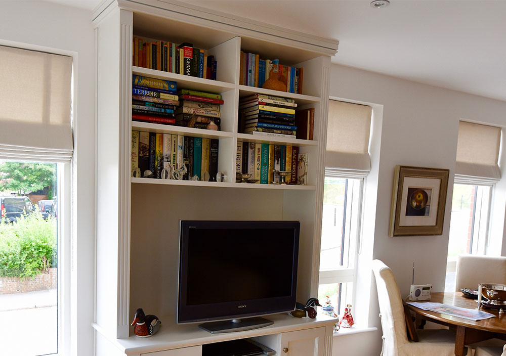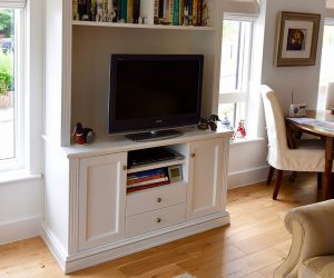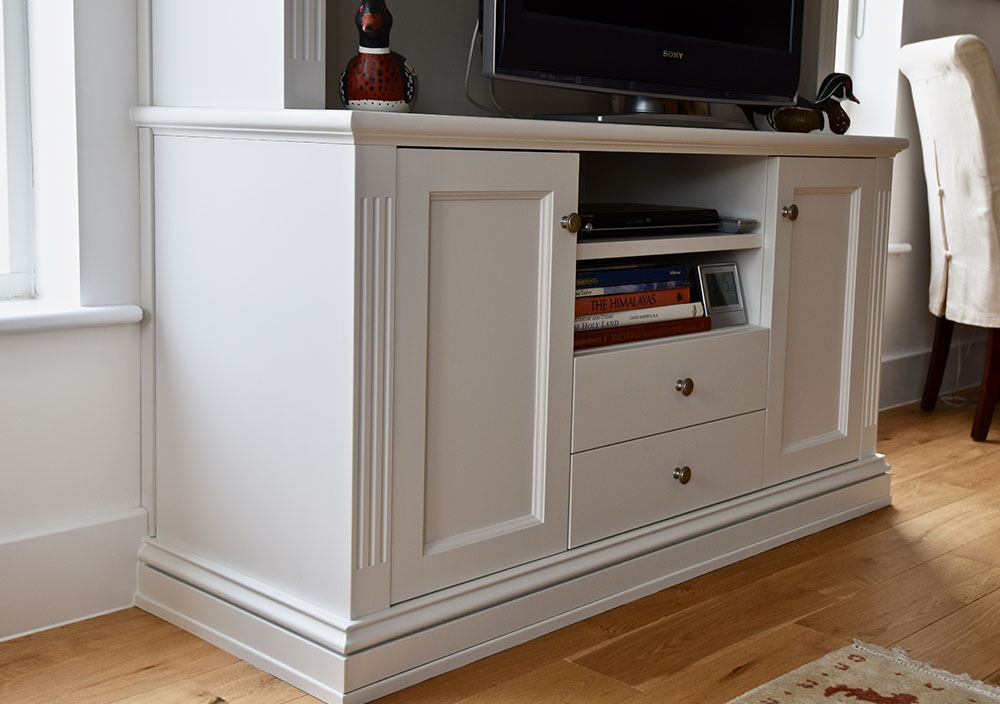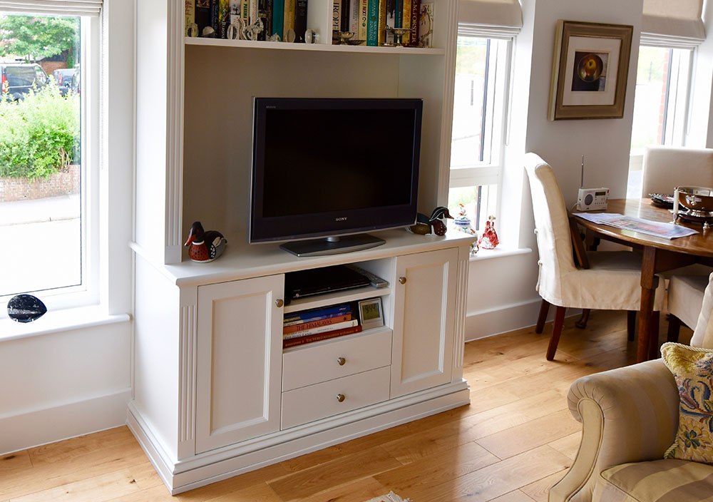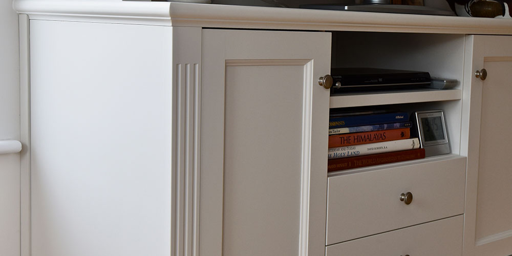 The result is this floor to ceiling design which is tailored to feel a seamless part of the living room. The cabinet has a built-in display area for the TV and a useful mix of cupboards, drawers and bookshelves. The style of this bespoke cabinet matches the interior décor of the client’s attractive period home and has been spray painted in a satin matt white for easy maintenance and durability.