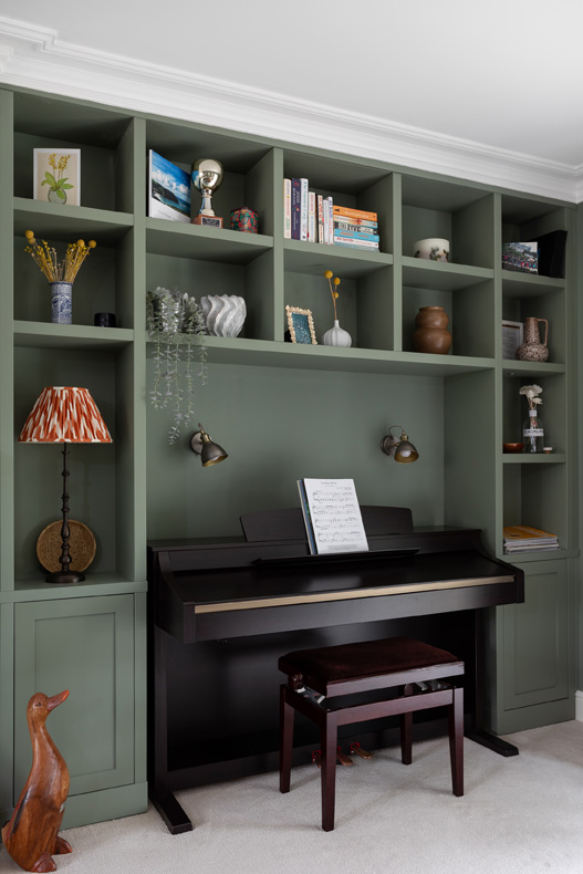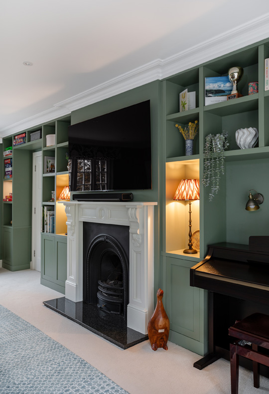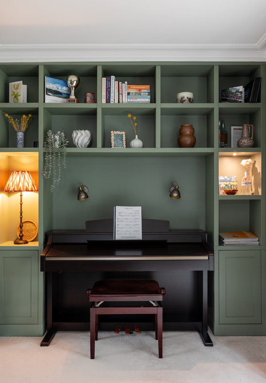 The floor to ceiling and wall to wall bespoke cabinetry wraps around the doorway leading to the entrance hall. Other features include a custom-lit space to accommodate a piano, two fireside niches housing a pair of matching table lamps and tailored cubbyhole display boxes. Cubbies are more versatile than shelving in a unit, as they can display items such as ornaments and pictures and can be individually customised with lighting, doors or internal shelves. The result is a beautifully organised multipurpose media room and music lounge for relaxing, watching TV, entertaining and playing the piano.