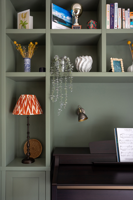 The made to measure fitted unit has been customised with integrated lighting. Lights include spotlights for the piano player, essential for reading sheet music, and flush built in mini-LED downlights in some of the display openings to highlight key items. Concealed sensors mean it only takes a wave of the hand to dim or switch the lights on or off. Both lighting and cabling were installed into the cabinets prior to installation with wiring concealed, yet accessible