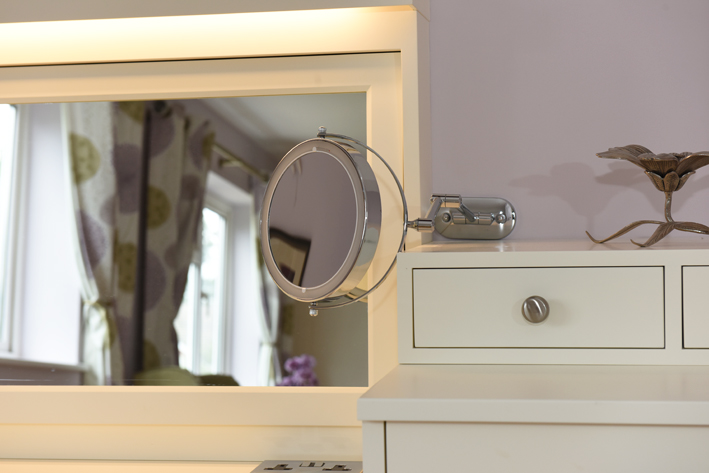 This dressing table was uniquely tailored for our client’s requirements. It features a range of drawers all customised to hold cosmetics, jewellery and accessories. The large central vanity mirror is designed to swivel and is illuminated by concealed lighting in the decorative pelmet, A second extendable magnifying mirror is perfect for close-up needs.