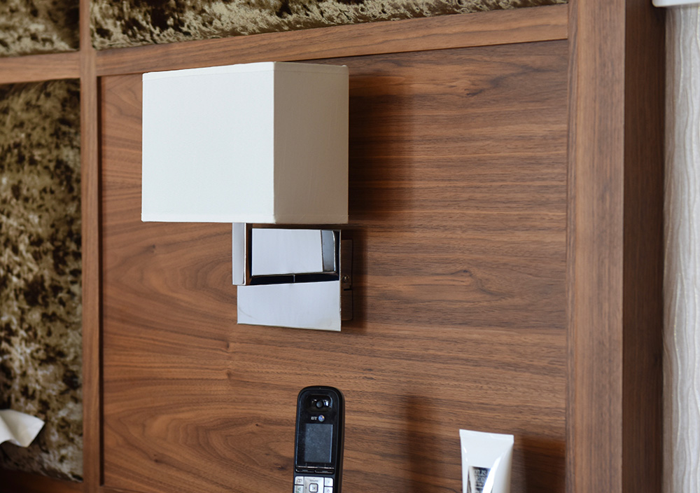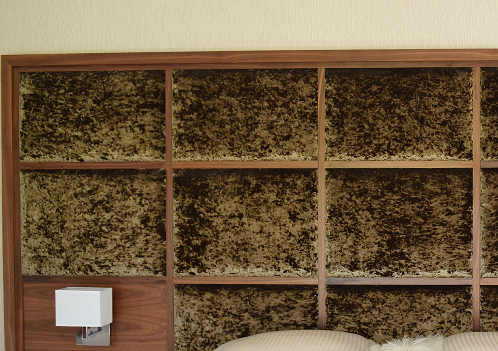 The suspended bedside single drawer cabinets contain cleverly integrated built-in power points and customised compartments for phones and other devices.