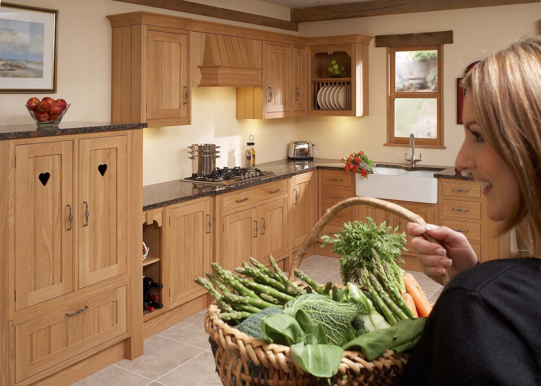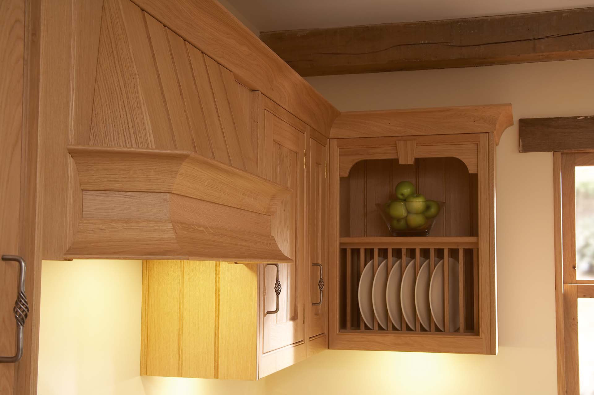 This attractive bespoke oak kitchen has been designed and built in a traditional English country style with stop chamfered cabinet frames and doors. Handcrafted in solid oak with appealing period detailing this kitchen combines an old-world rural charm with a style and finish that is perfect for a contemporary lifestyle. The natural oak cabinetry features inset bead and butt cabinet doors set in a cock bead frame. The doors have been polished and finished with a satin matt, clear lacquer and hung on solid brass hinges. Special features include a matching decorative oak cooker canopy hood and handcrafted plate and wine racks.
