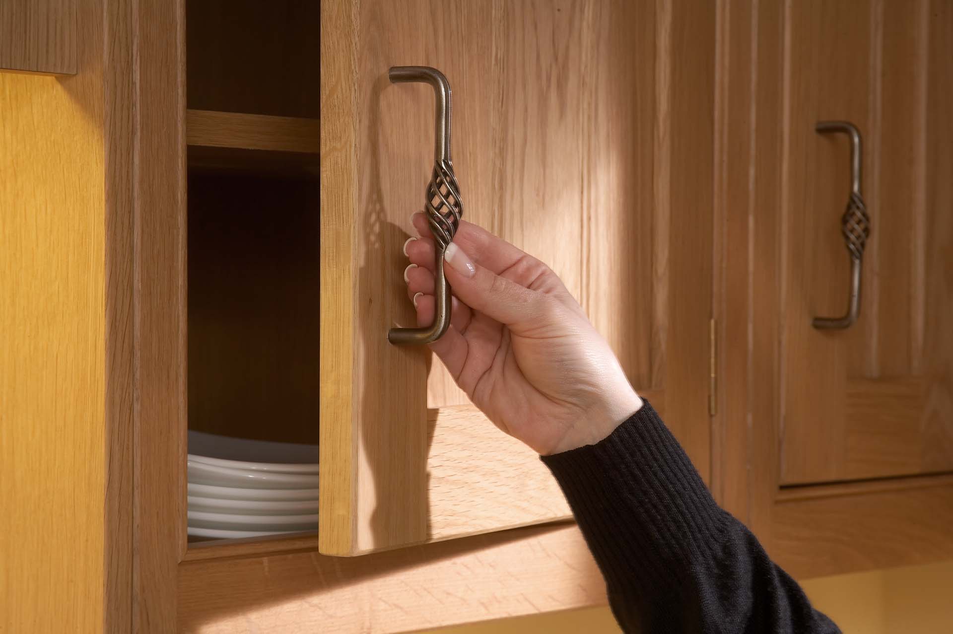 Our client chose these exquisite wrought iron twisted handles which add a rustic charm to the cabinets. Luxury cupboard door and drawer handles add the perfect finishing touch to your cabinetry and are an important choice for the look of your kitchen. With so many shapes, sizes, colours and finishes available they can make cabinets look very different.