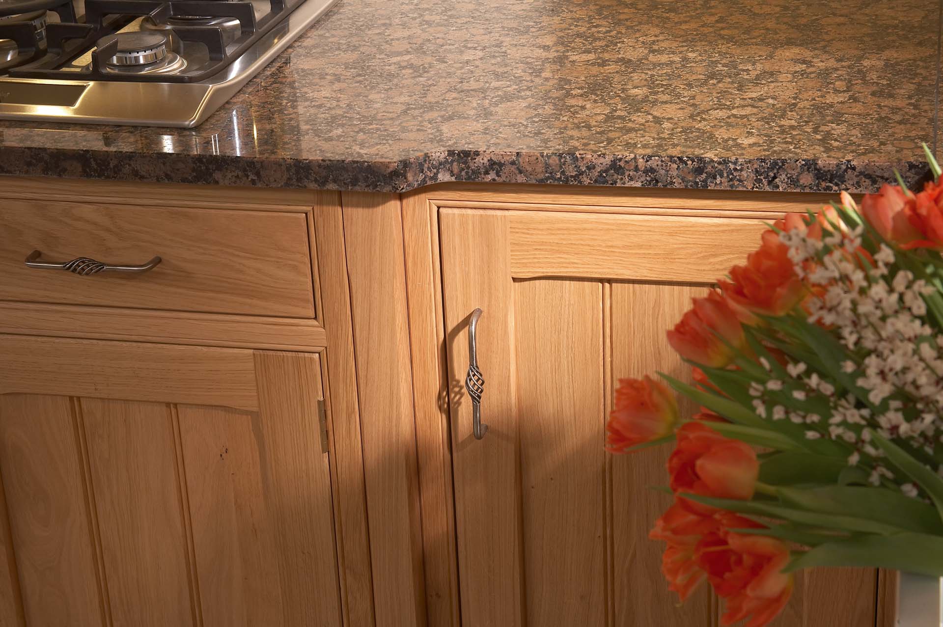 A carefully designed classic country kitchen in natural oak has a quality and warmth that will never date. These cabinet doors are created in a timeless shaker design with a four-sided stop chamfer. Stop chamfers add architectural interest to the cabinetry. The worktops have also been uniquely handcrafted in solid oak for exceptional durability and character.