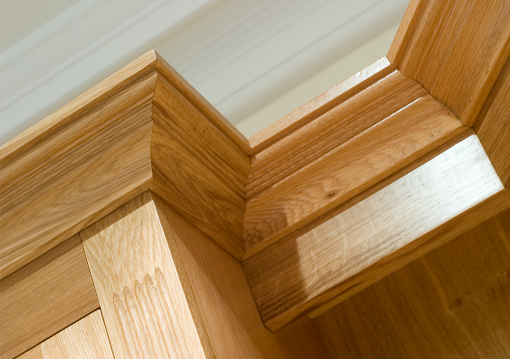 The study showcases traditional wood craftsmanship at its best. Details like the raised and fielded panelled doors and classic cornice matching the desktop edge gives the study a distinguished character. While integrated media such as the wall-mounted TV screen with concealed cabling brings updates the classic design for a modern lifestyle.