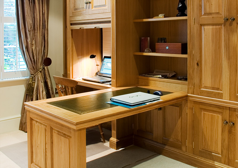 This bespoke traditional panelled oak study is a fully-fitted multipurpose room combining an executive home office with a media entertainment area for our client in Weybridge, Surrey. The bespoke built-in furniture is made in solid oak with carefully crafted features to cater for all our client’s needs and comforts. It provides the perfect retreat for work and play.