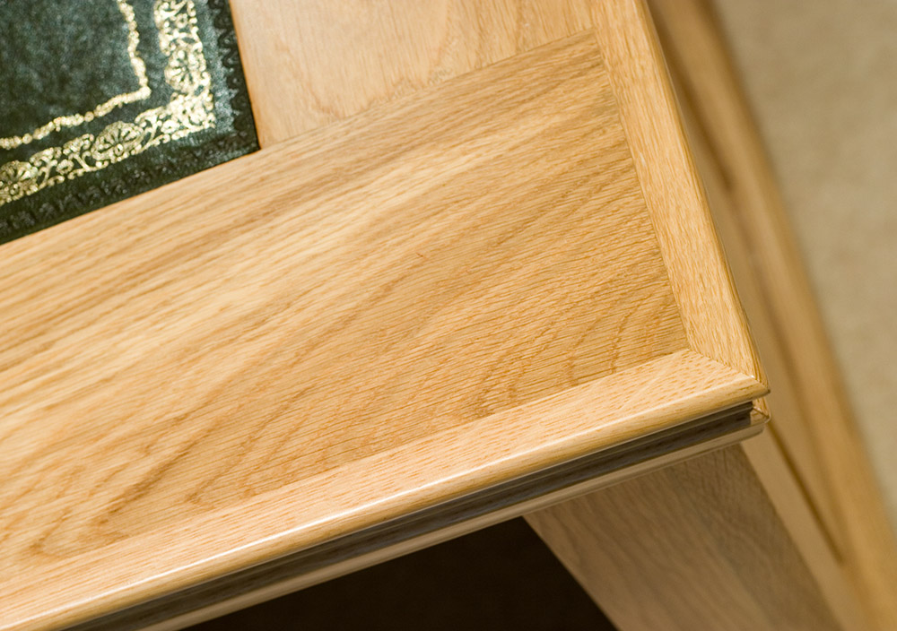 This bespoke peninsular desk features a classic trim and is supported by a solid oak, raised and fielded end panel. A rich green fine leather inlay with gilded decorative edging adds a touch of luxury and practicality. Traditionally incorporated into desks to make writing easier, the fine supple leather is pleasant to write on.