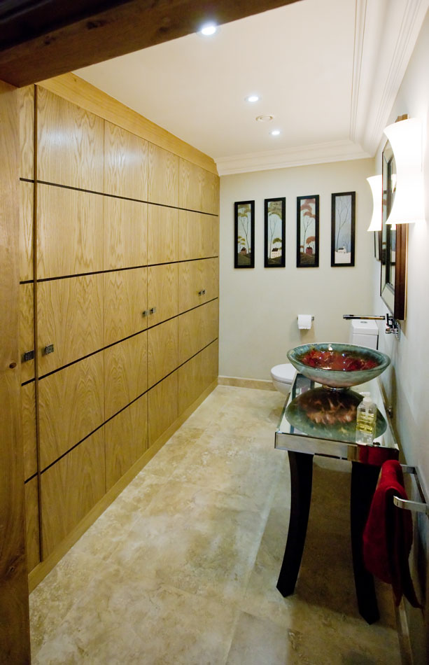 Concealed lighting is a must in darker rooms especially if there is little natural daylight. The light oak wood doors blend very well with the natural stone flooring and reflect the light around the room. The interior of the cupboard is fully lined with a straight grain, light oak veneer which further reflects the light.