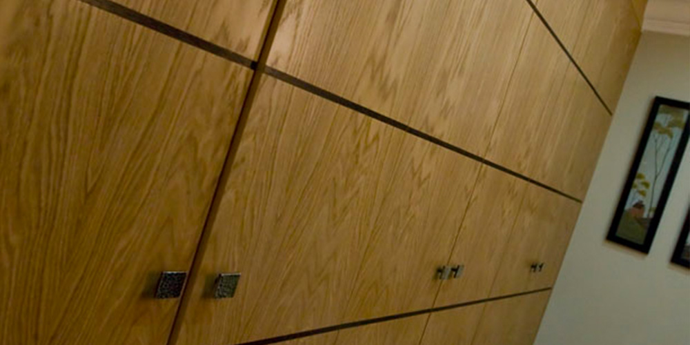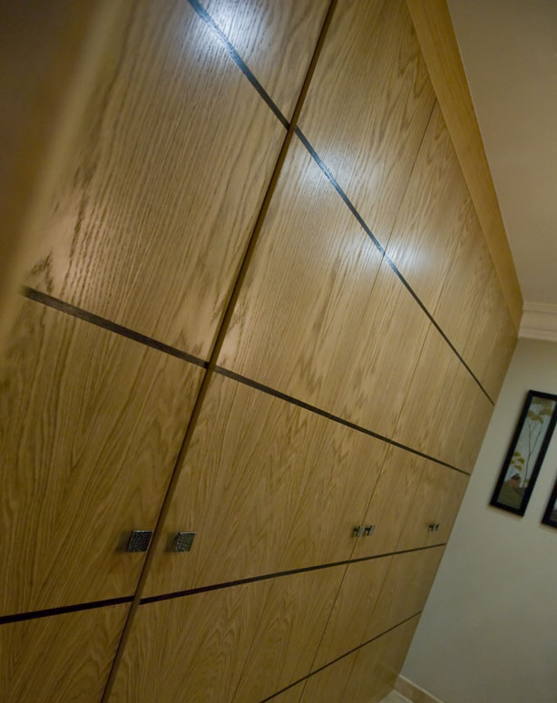 The closet wardrobe has been made to exhibit the beautiful vertical, crown cut, oak wood grain. To enhance this we have have inlaid some shadow gaps in ebony wood effect. The square, pewter hammered door handles finish the look off nicely.