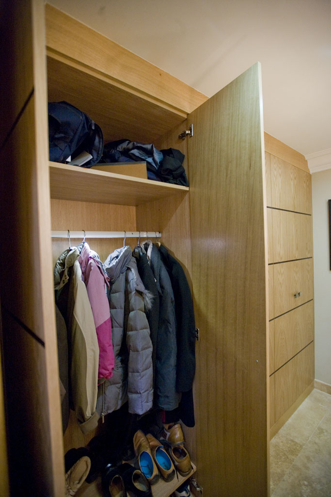 This was originally a very large downstairs closet room. Our client needed much more boot room space for hanging coats and storage for shoes and we designed a full height, contemporary oak wardrobe to maximise the storage space.
