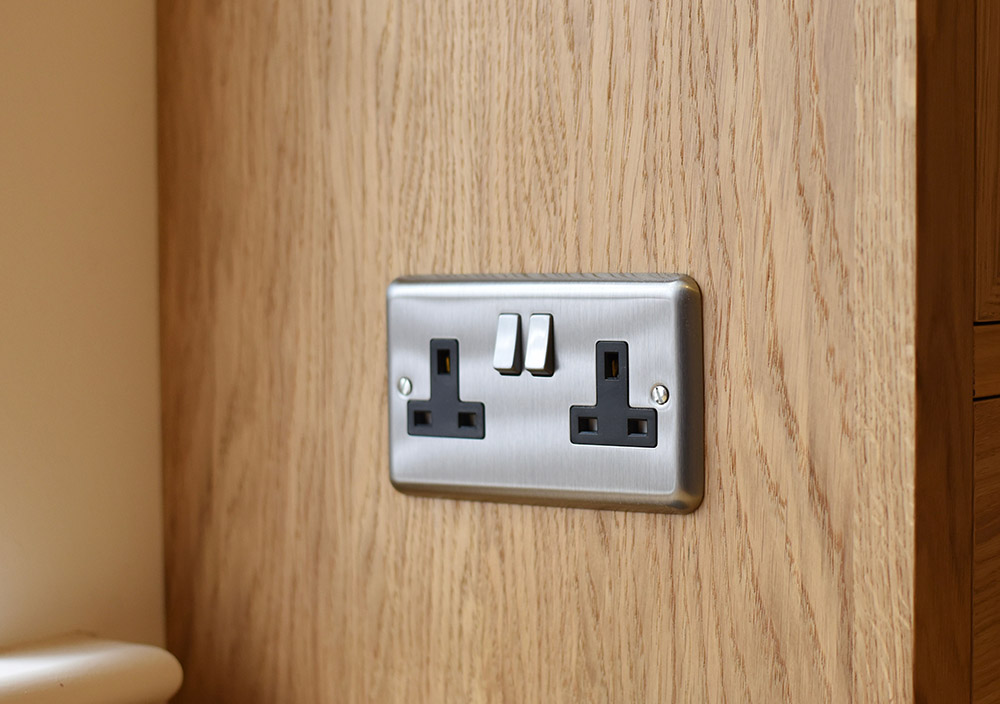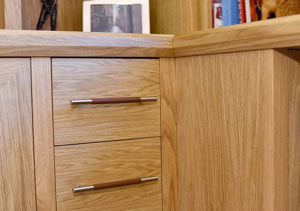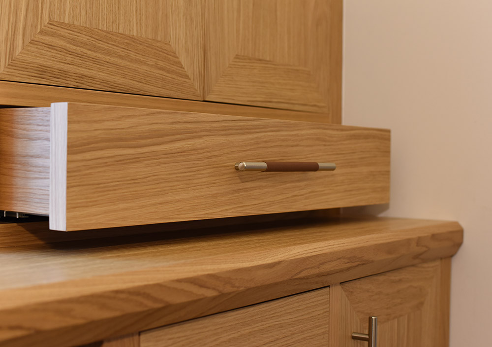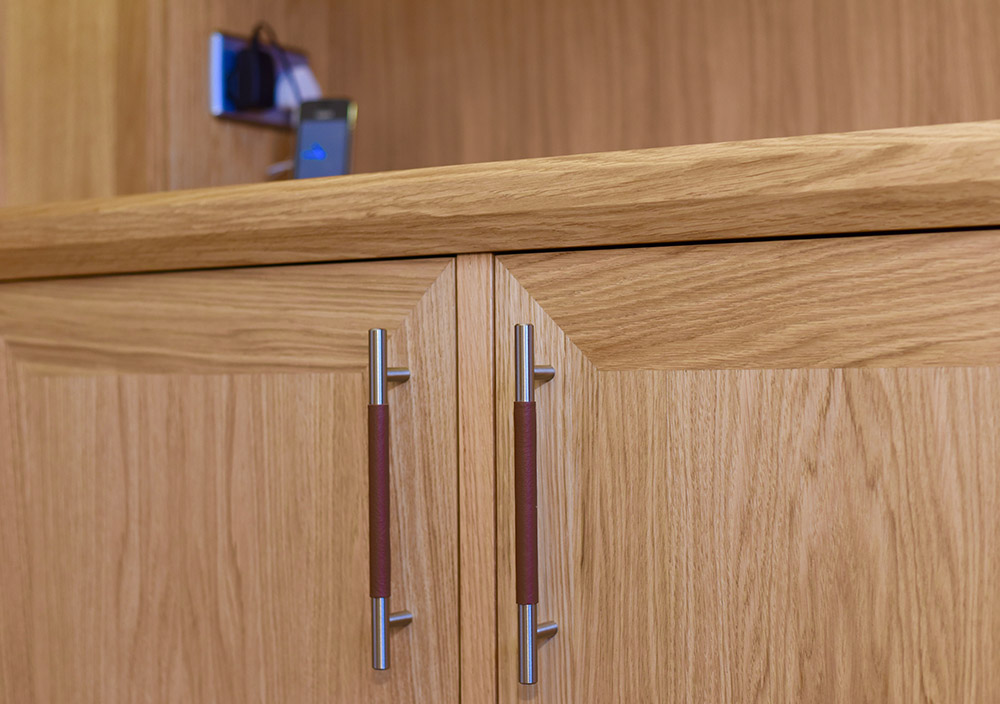 The handcrafted flat doors feature mitred corners with the long oak wood grain wrapping all four edges. This gives an attractive picture frame effect to the doors to contrast with the vertical grain of the panels. Slim leather and satin chrome handles add an extra touch of luxury.