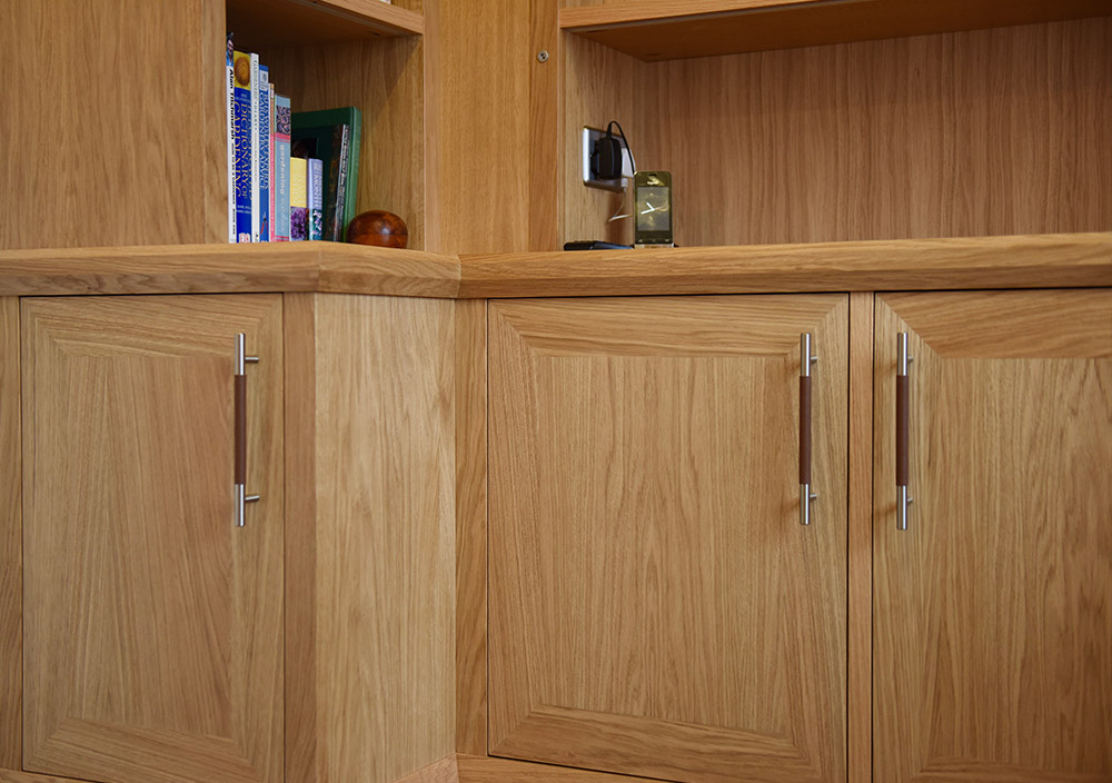 This classic bespoke fitted study for our client’s home in Cranleigh, Surrey, has been handcrafted in natural light oak wood for a classic look. The extensive suite of made to measure furniture has a range of built-in storage, worktops and display features, all in the same timeless quality and finish to create a welcoming, stylish space.
