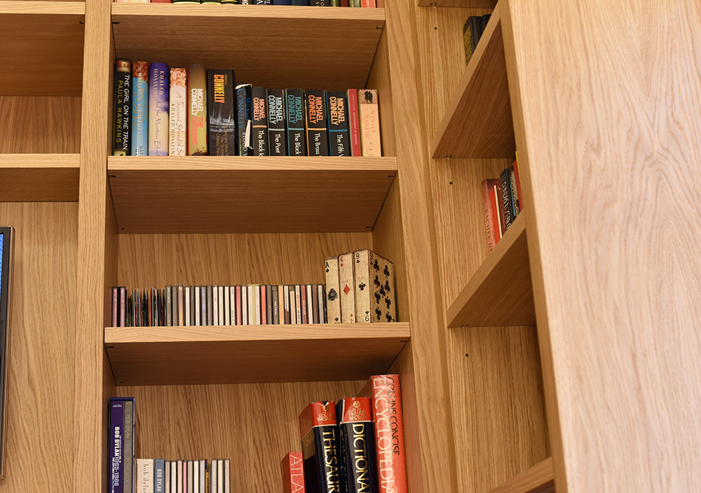 Every practical need has been taken care of with a wall mounted TV screen, tailored shelving and cleverly placed drawers under the cabinet doors which provide easier access to smaller contents. The built-in furniture cleverly conceals all the cabling and wiring. There are plenty of integrated power points too – an essential ingredient of any study today.