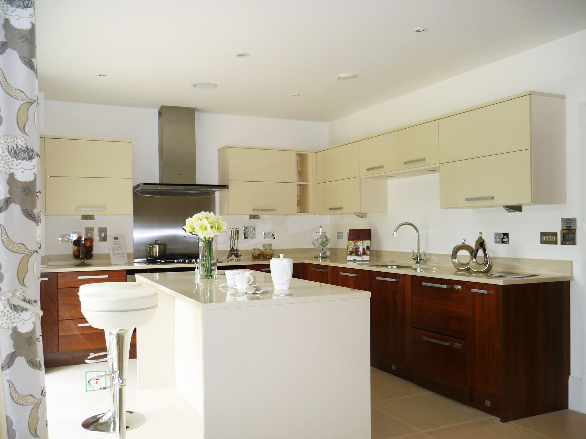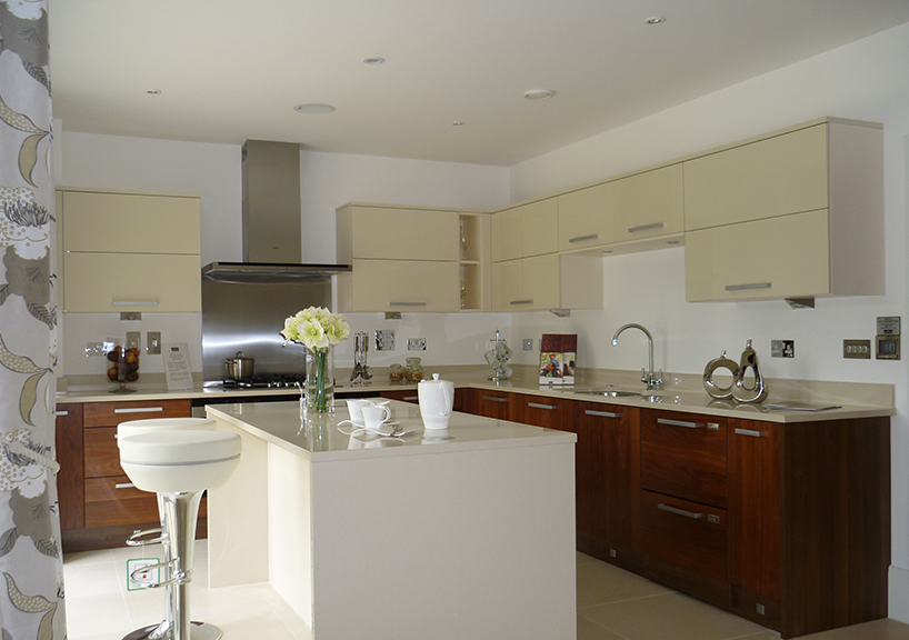 The mix of black walnut and ivory high gloss doors creates a strong, sophisticated look. The clean contemporary lines of this luxury kitchen are enhanced by the designer metal flat bar handles. Bespoke lighting, tailored storage and appliances are arranged discreetly around the room. Here, we have installed a built-in coffee machine, which is a must for enjoying an espresso at the fabulous island.
