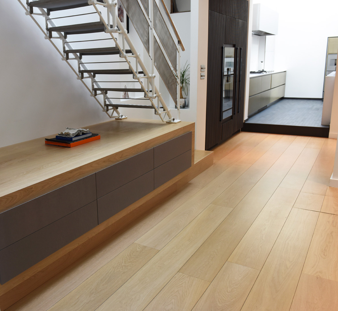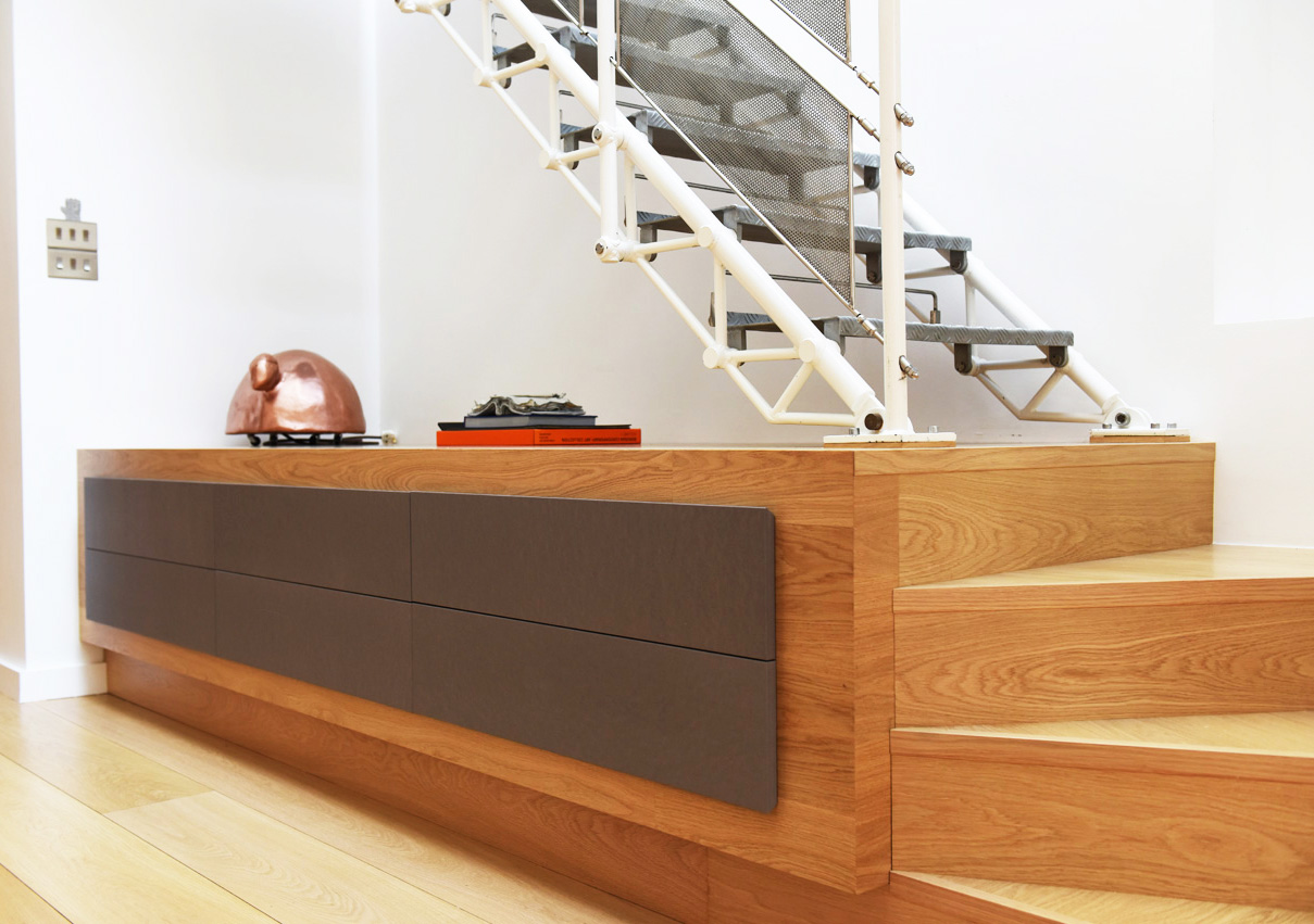 The wooden storage unit also needed to form the lower end of the staircase by incorporating three winding treads, allowing the stairs to turn ninety degrees.