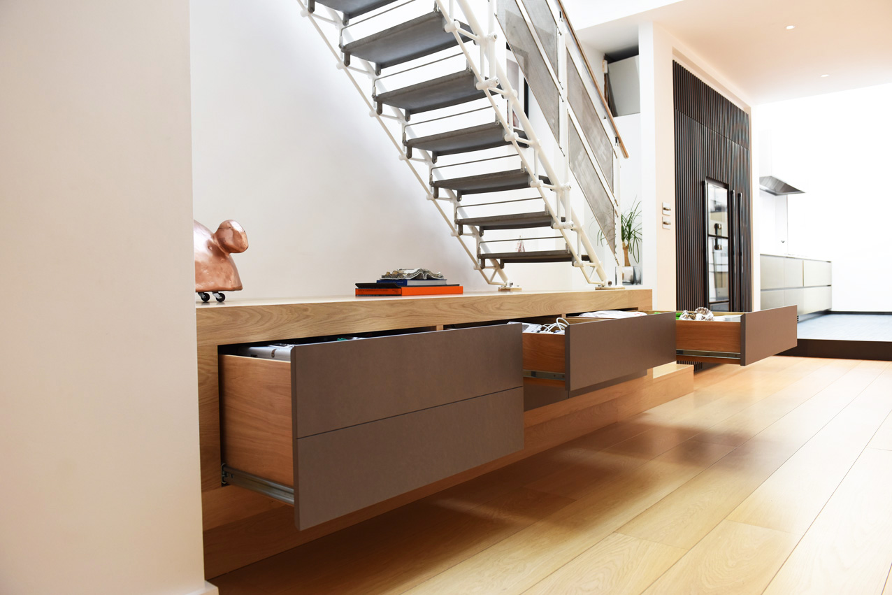 This unique contemporary understairs bespoke fitted cabinet was designed and built by Claude Clémaron for a property in Belgravia, London. Our bespoke joinery and cabinetmaking skills really came to the fore in this special commission. The brief was to construct a cabinet that would support the metal fabricated staircase. Timber works beautifully with contrasting staircase materials such as glass, metal, or stone.