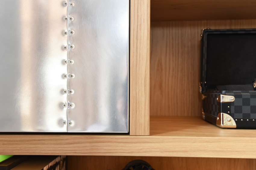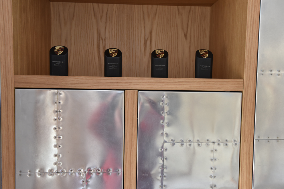 The eye-catching aluminium handle-less door and drawer fronts have a jet silver finish. Designed and crafted to mimic the vintage plane’s riveted exterior, the cabinet’s aluminium panels give the piece a unique character, much like the legendary planes they pay tribute to. The cool metal sits beautifully with the natural warm oak and gives the furniture an on-trend retro industrial look. To create a striking contrast, the backs of the doors and drawer fronts have been spray-painted with matt black paint.