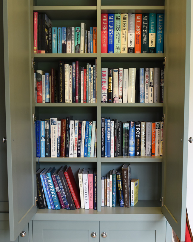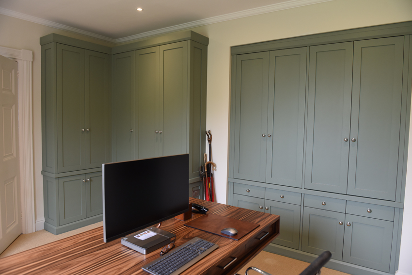 The handcrafted cabinets, with shaker style doors and polished chrome knobs, have been flawlessly painted in Farrow and Ball Cardroom Green. This strong, dark green was popular in Victorian studies and echoes the best-known colour in motorsport, British racing green. Dark tones are smart and business-like yet also feel inviting and contemporary, especially when used on woodwork.