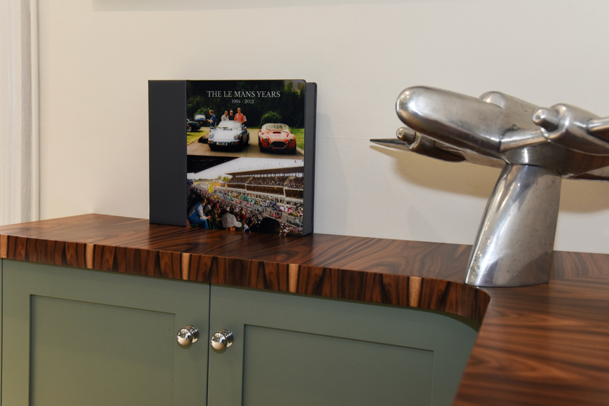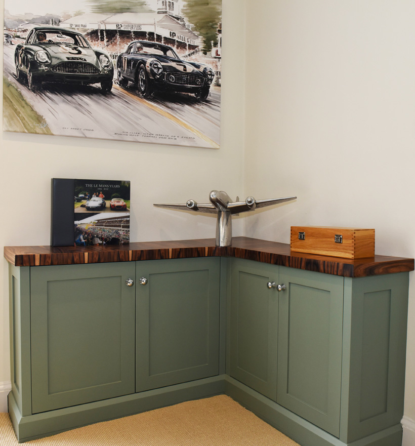 This customised racing-inspired home office was created to indulge our client’s passion for motorsports. Two shallow chimney breast alcove units, built with illuminated glass shelves, display favourite racing memorabilia and artefacts. All the fitted cabinetry makes use of the available space, with surface tops featuring a simple thick flush flat edge and plinths and cornices trimmed with a chamfered design.