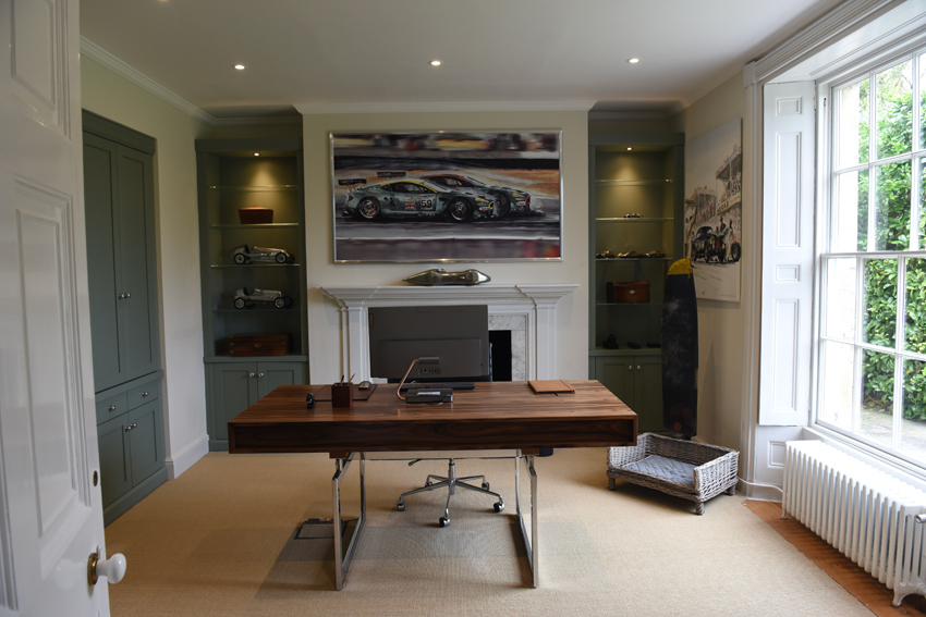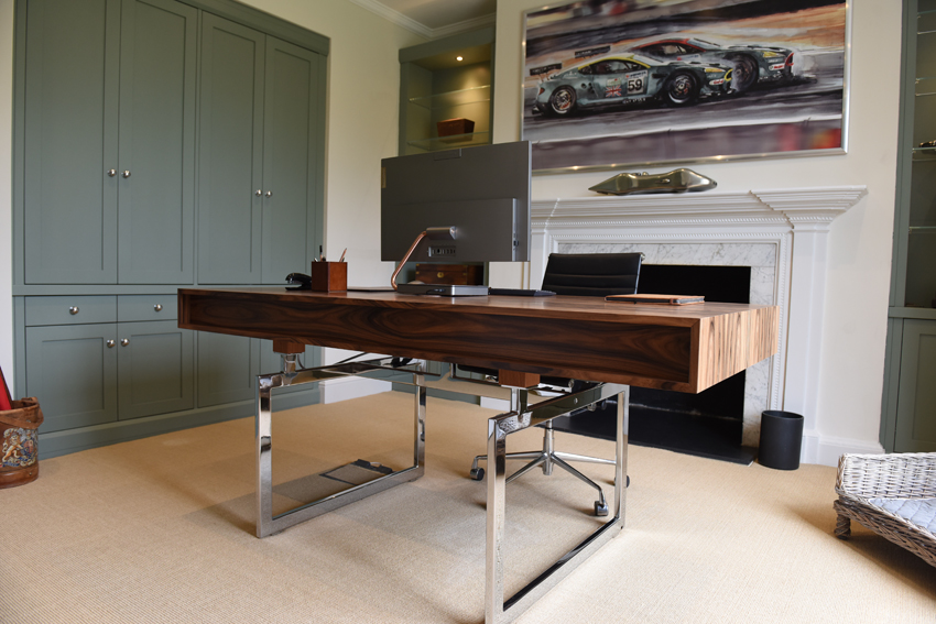 The large, handsome bespoke desk takes centre stage in the room and was specially commissioned to reflect the iconic writing table which featured in three James Bond movies. The resulting home office interior has a suave, sophisticated look, fit for 007 himself.