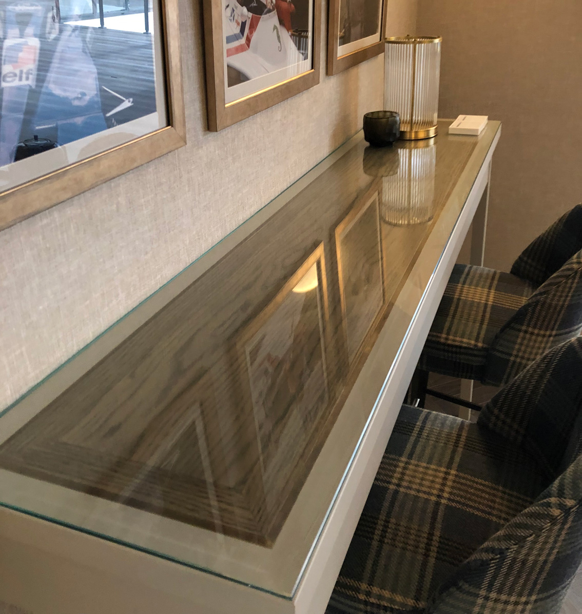 Handcrafted in oak wood, the bar front has a matt chic blue-grey finish with enhanced elegant, raised beading and an antique brass heavy duty foot rail. The back bar furniture features a stainless-steel sink, drainer, storage and undercounter appliances. A smaller two-stool bar console table has a clear 6mm safety glass countertop which is easy to maintain and adds reflective sparkle. The TV screen on the wall has been framed and hand painted to match in Farrow & Ball Blackened with brass inlaid strips hand finished with an antique patina.