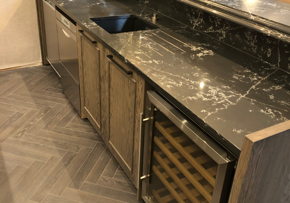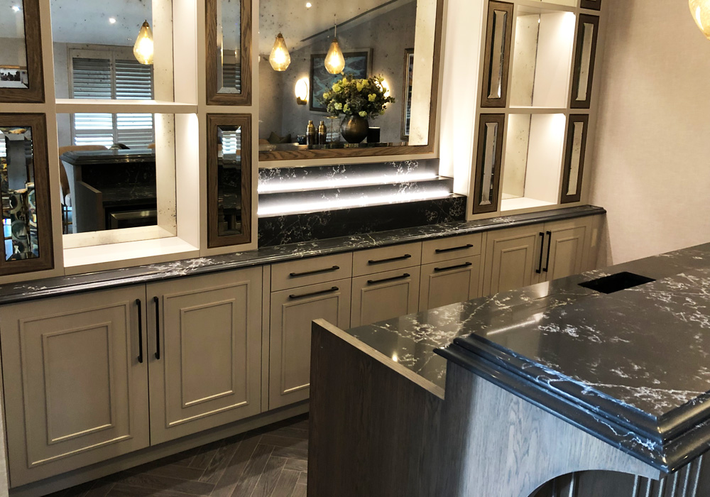 The countertops are made from a classic black quartz stone from local Surrey firm Elliott Stone Works. The hand finished double ogee waterfall edge looks stunning.