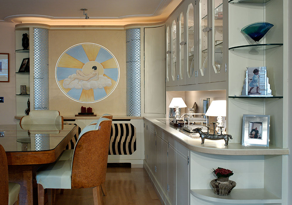 This stunning set of bespoke art deco style cabinets forms a show stopping feature in this corner of this Chelsea dining room. Curves, bold geometric shapes, and glitter are what this custom-designed cabinetry is all about and defines the opulent and glamorous art deco style. This was a thrilling commission to work on and showcases our bespoke furniture making at its most exuberant. Just take a look at the decadent detailing and craftsmanship which has been put into the integrated radiator cabinet just below the very impressive circular piece of art.